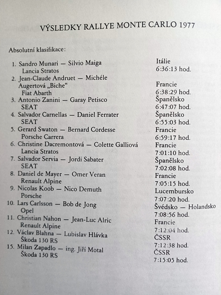 Výsledky na Monte Carlu s umístěním ve třídě do 1300 ccm na 1. místě posádky Václav Blahna – Lubislav Hlávka, 2. Milan Zapadlo – Jiří Motal a celkově 12. respektive 15. v konkurenci silnějších vozidel bylo bezpochyby úspěchem.